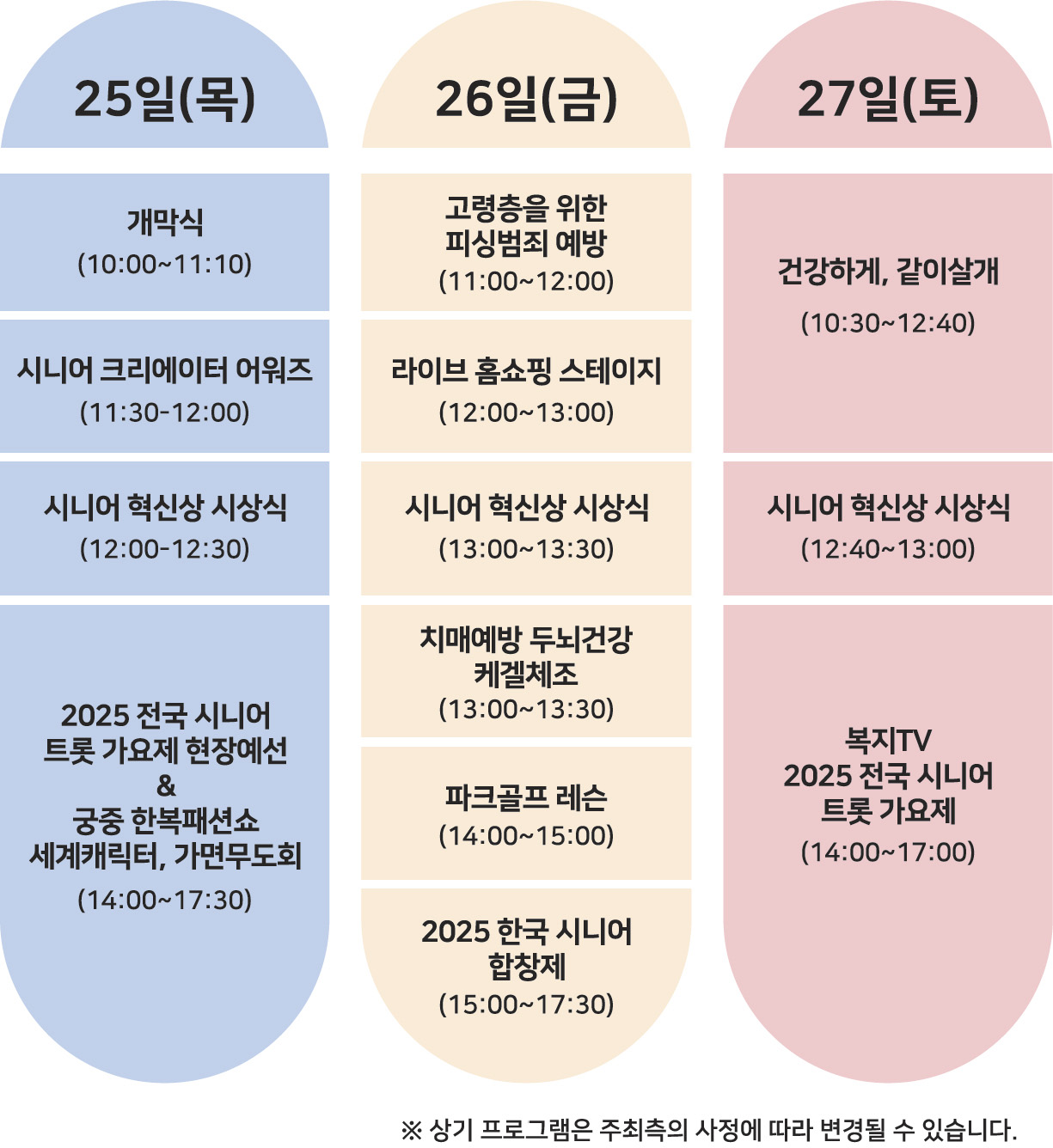 ½Ã°£ | 25ÀÏ (¸ñ) | 26ÀÏ (±Ý) | 27ÀÏ (Åä) |